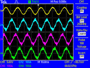 為在交流線路電壓上進行測量及檢查其對電源失真系統的影響,電源分析應用軟件顯示了直到 50 階諧波的諧波成分,提供了相位、無功功耗和功率因數測量功能。通過四通道 TPS2014B 或 TPS2024B,可觀察三相電壓或電流。